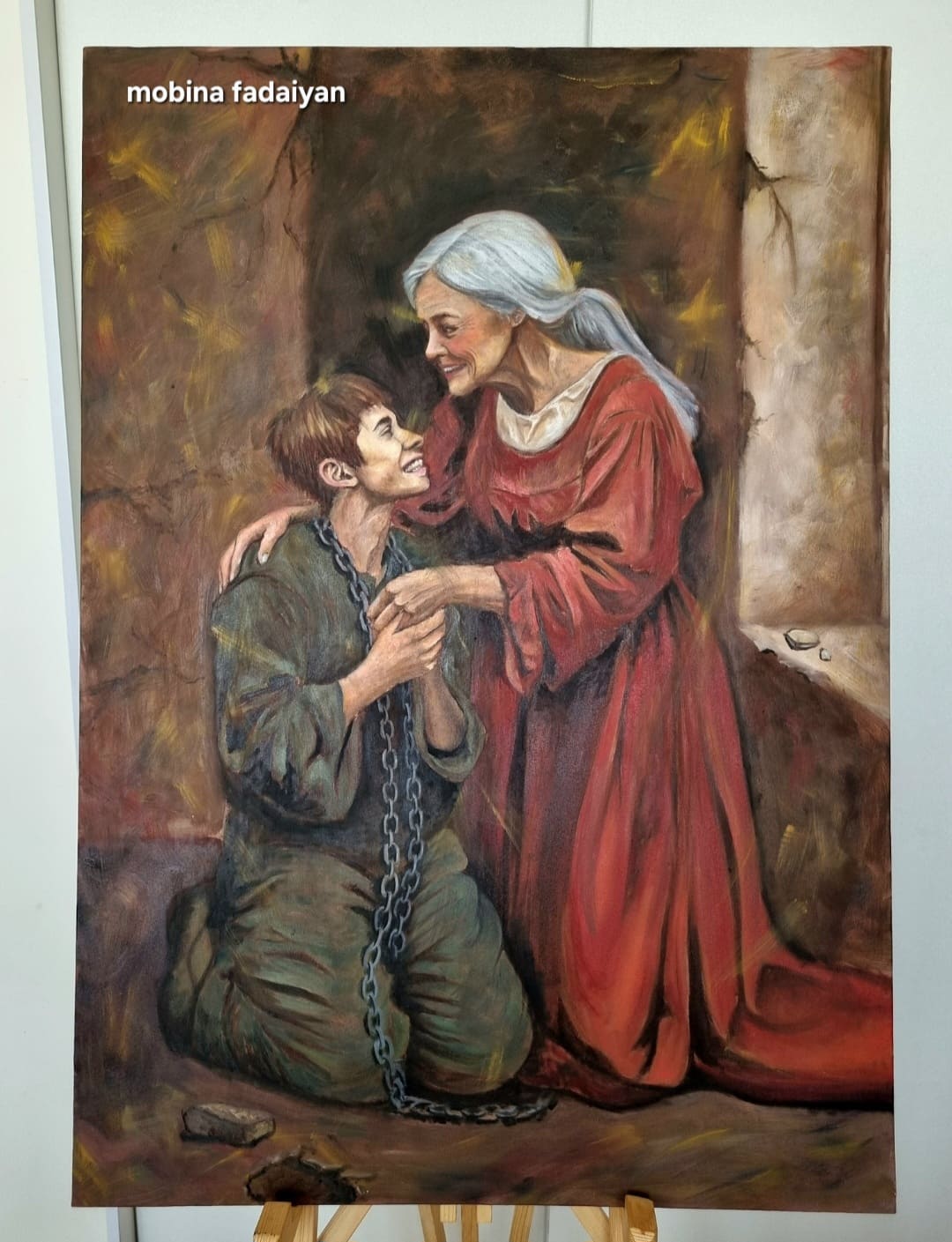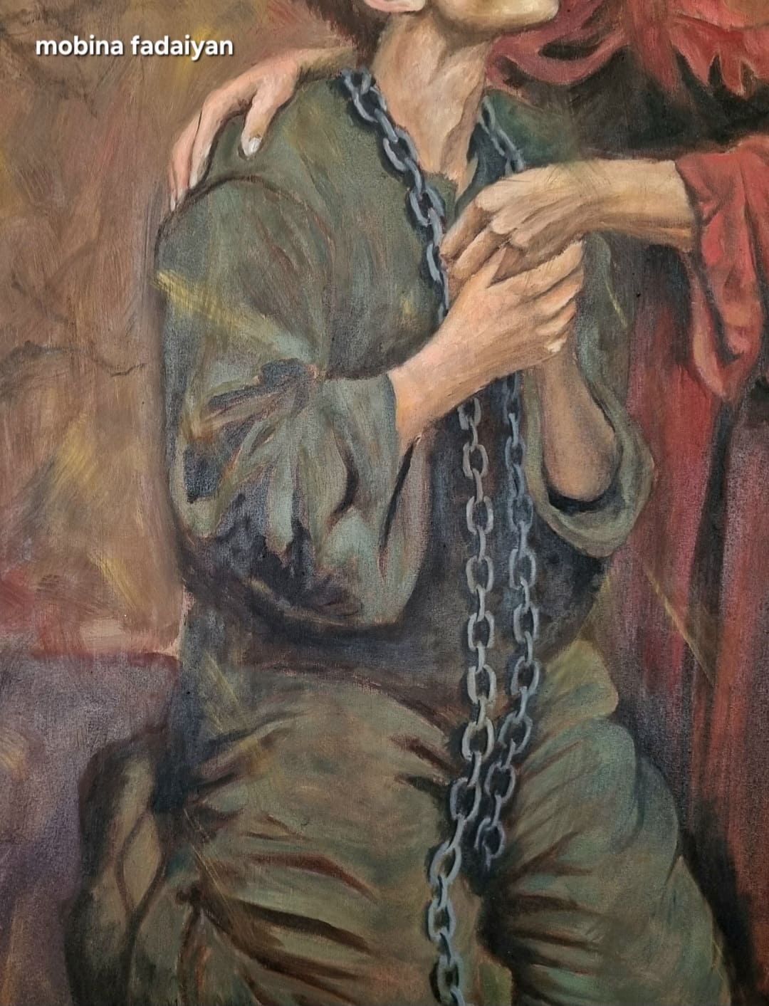 پسری که حتی در بزرگسالی هنوز در زنجیر وابستگی به مادر است زنجیری که نه از اهن بلکه از مهر بدون مرز و جدایی ناپذیر تنیده شده . وجود لبخندی از عشق اما زانو زدن از ناتوانی در ایستادن روی پای خود .