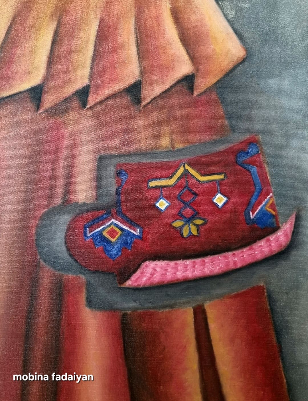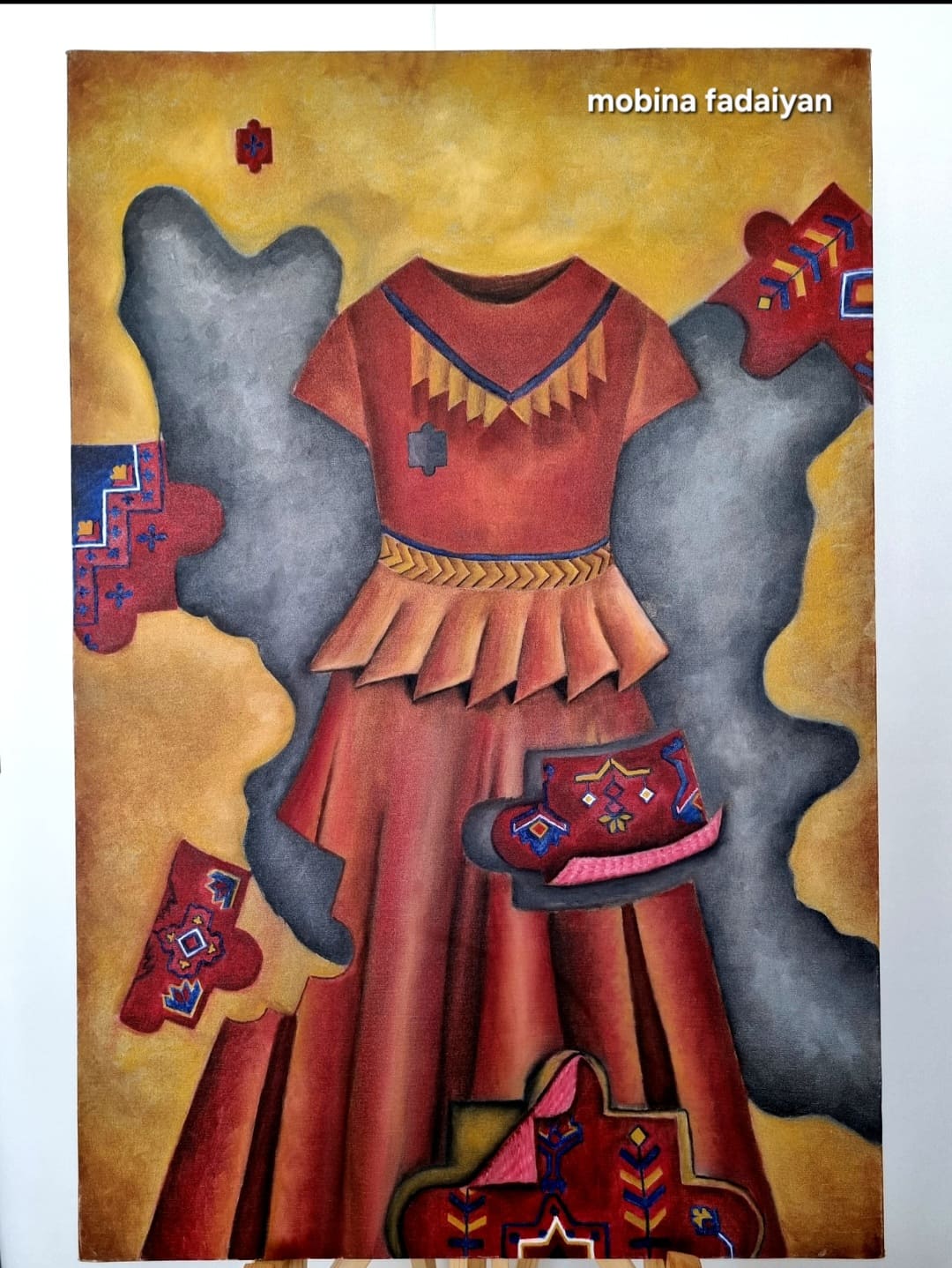 تابلوی هویت بافته شده . بازتابی از هویت زن ایرانی ست . لباس محلی زنانه و سنتی که فاقد پیکر است . این پیکر غایب پرسشی ست درباره جایگاه هویت و حضور زن در متن فرهنگی و جغرافیایی این سرزمین .