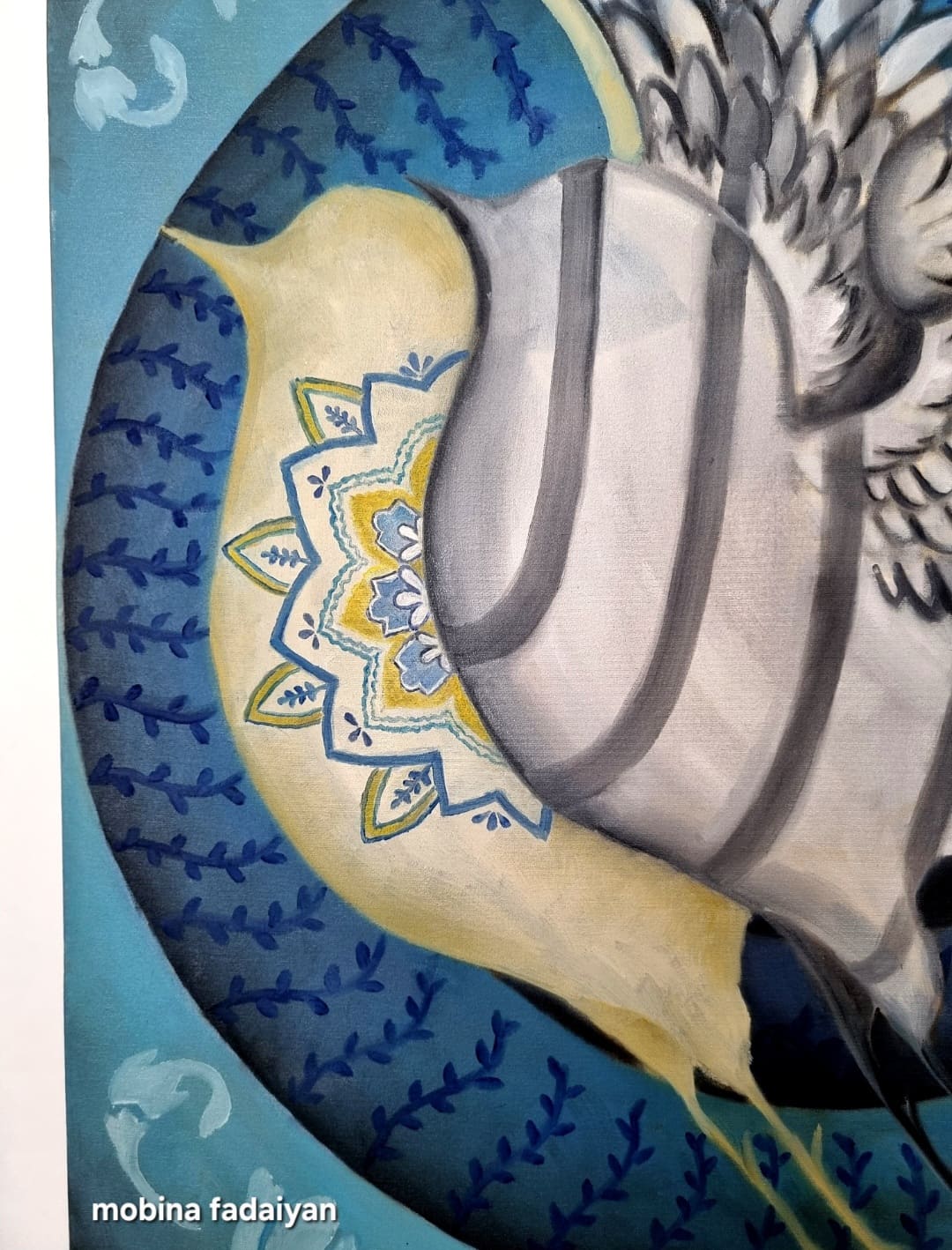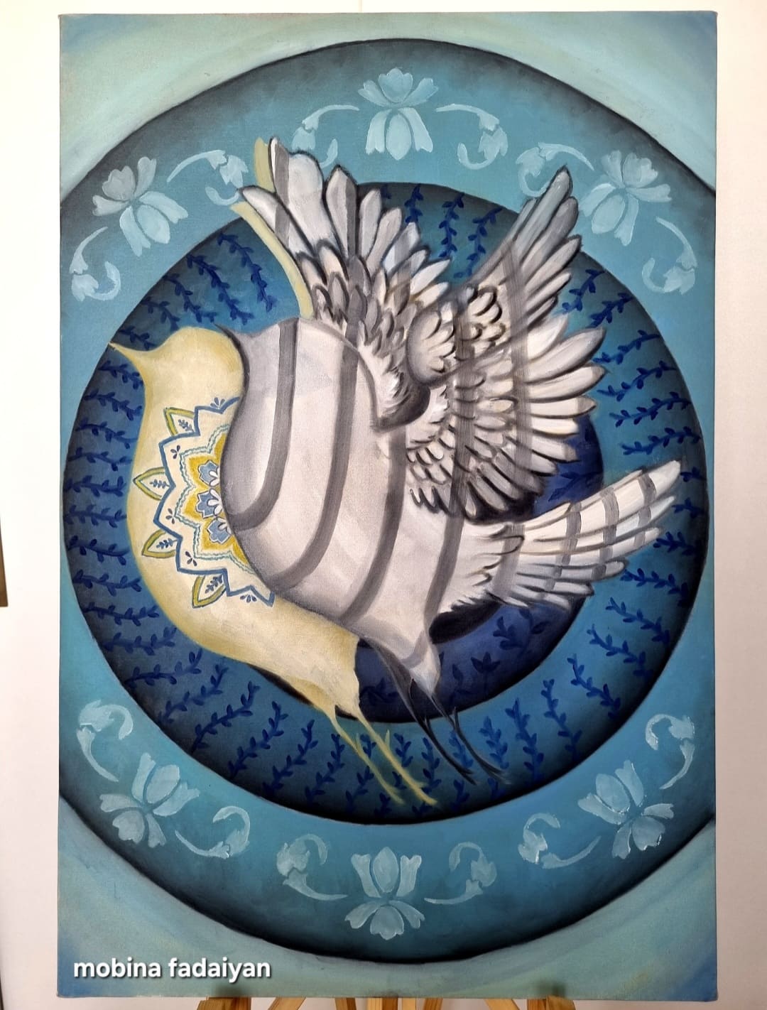 تابلو ی رویای محسوس روایتی ست از تضاد میان ظاهر و درون میان انچه هست و انچه میخواهد باشد . پرنده ای در قفس نقوش و فرم ها اسیر است اما رویای پرواز در سایه اش زنده است . او پر نمیزند اما روحش در حرکت است .